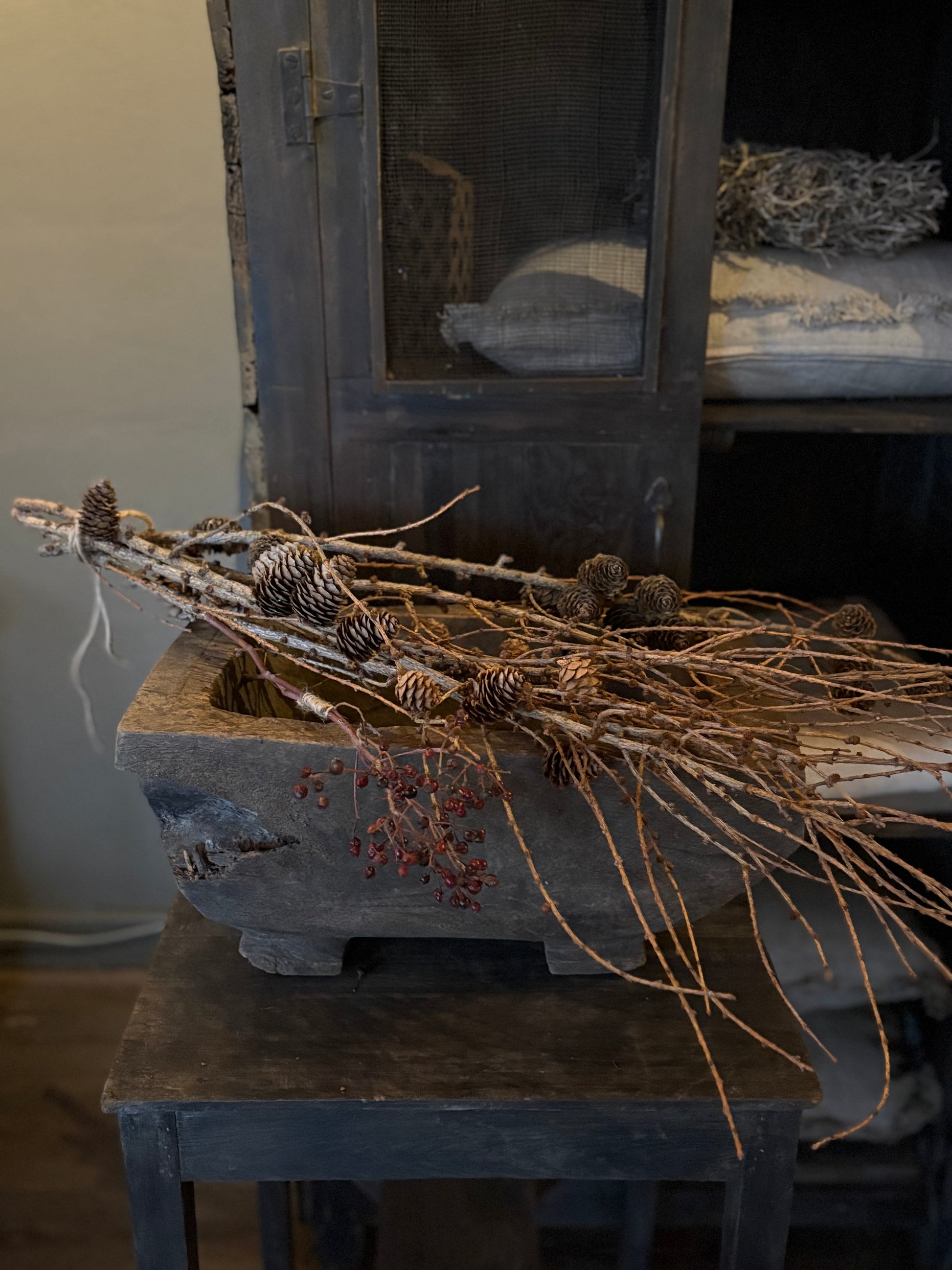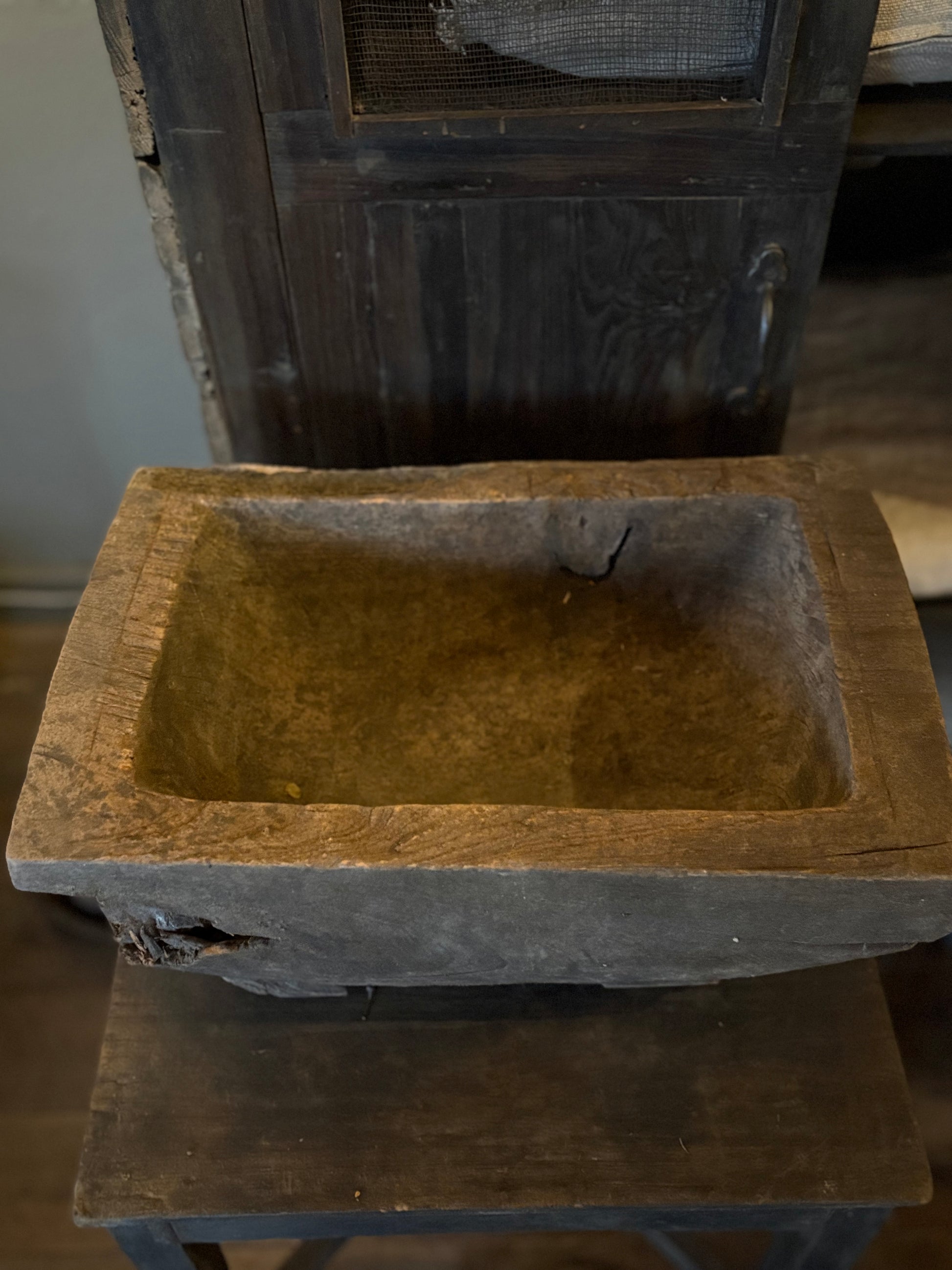 authentieke houten bak op pootjes, in donker bruin.