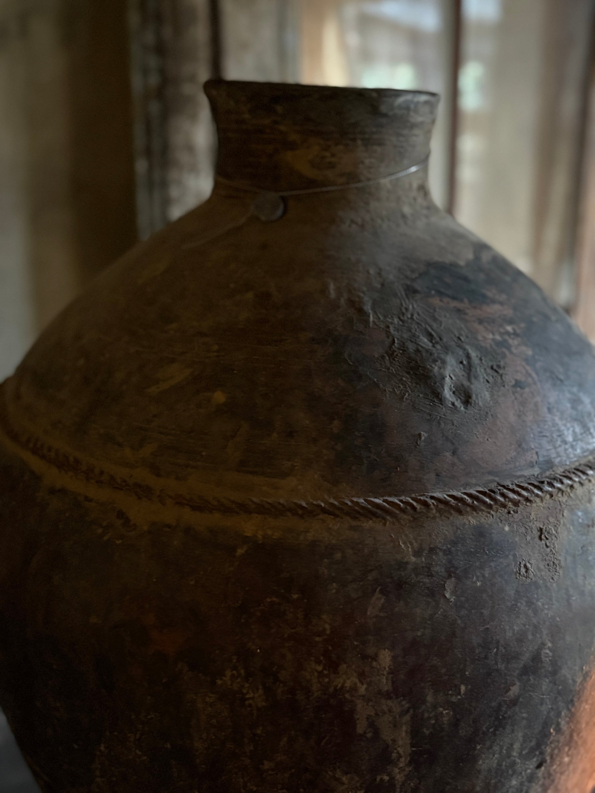 Grote authentieke pot op standaard 50x71cm inc standaard opening hals 15cm. in een mooie donkerbruine kleur.