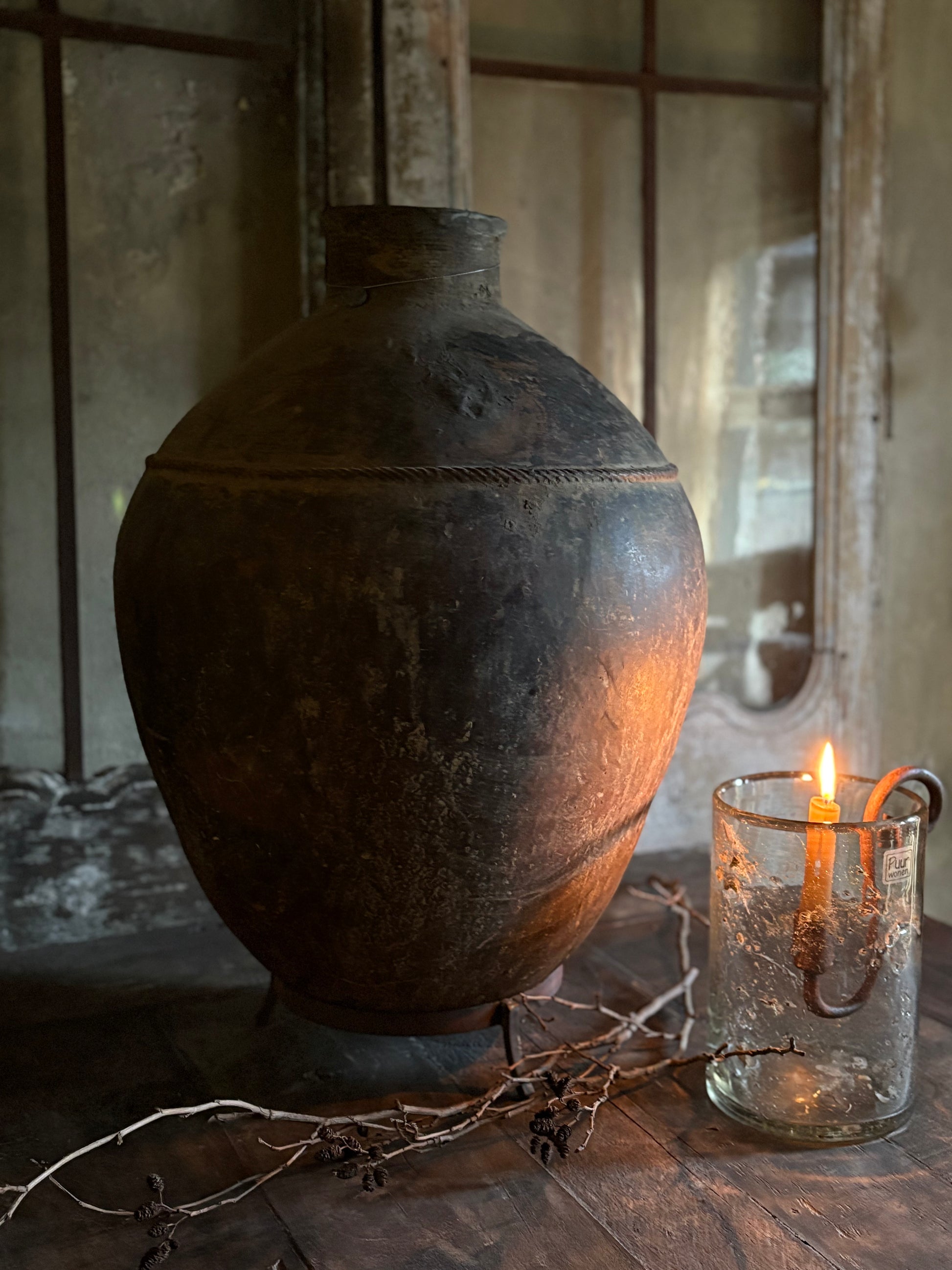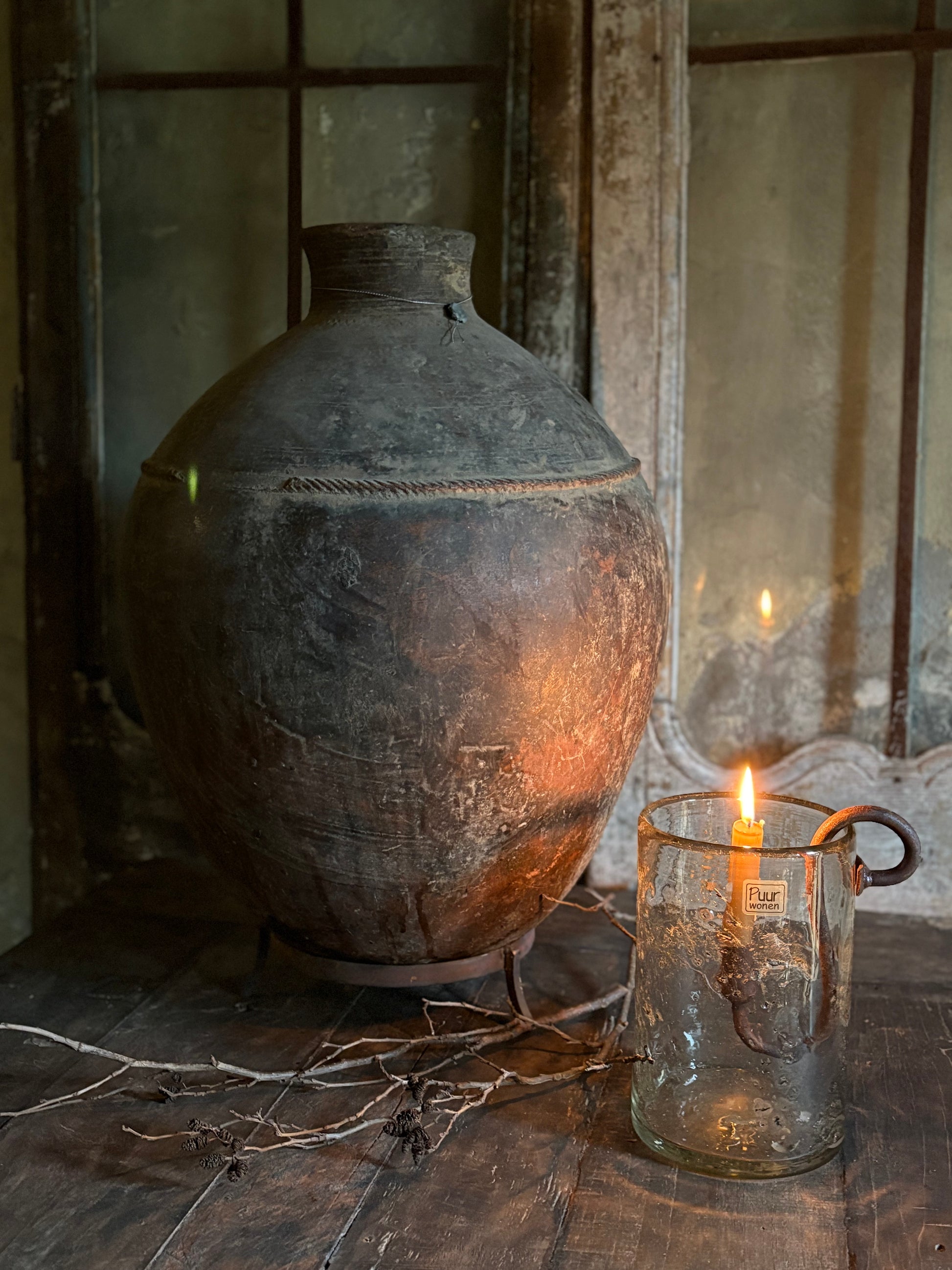 Authentieke stenen kruik op standaard