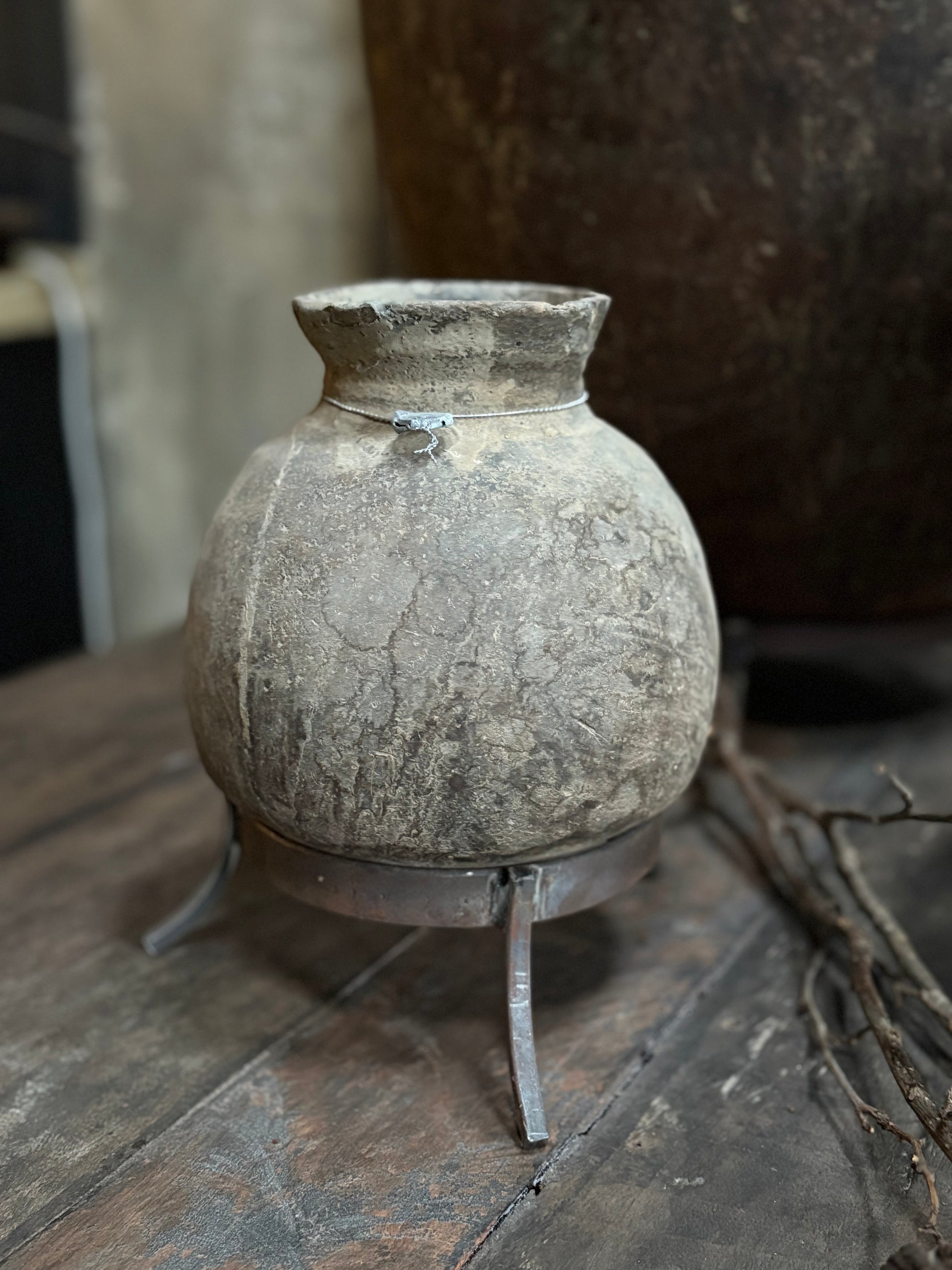 Authentieke stenen pot op standaard in een beige/ grijze kleur 21x26cm inc standaard.
