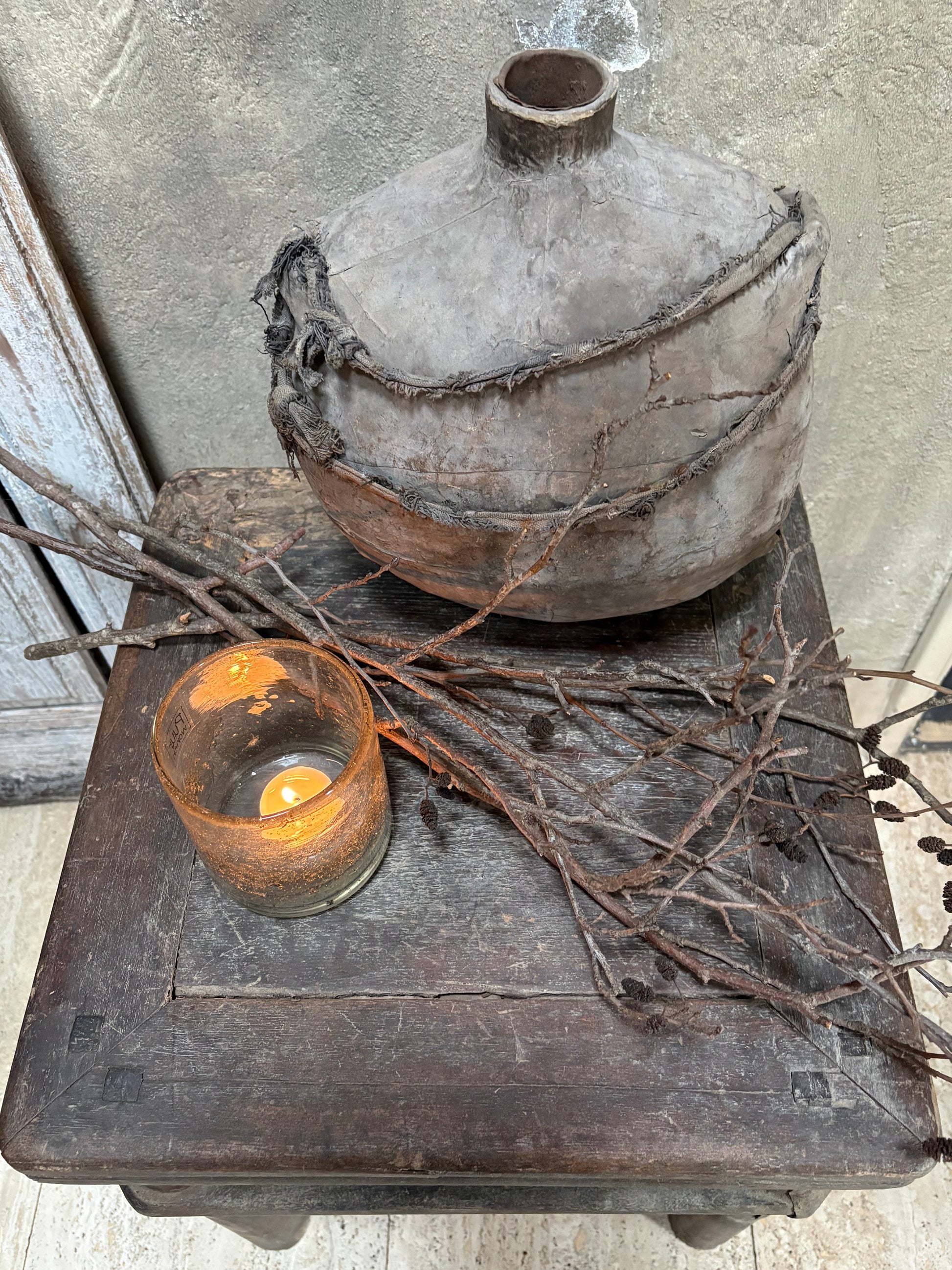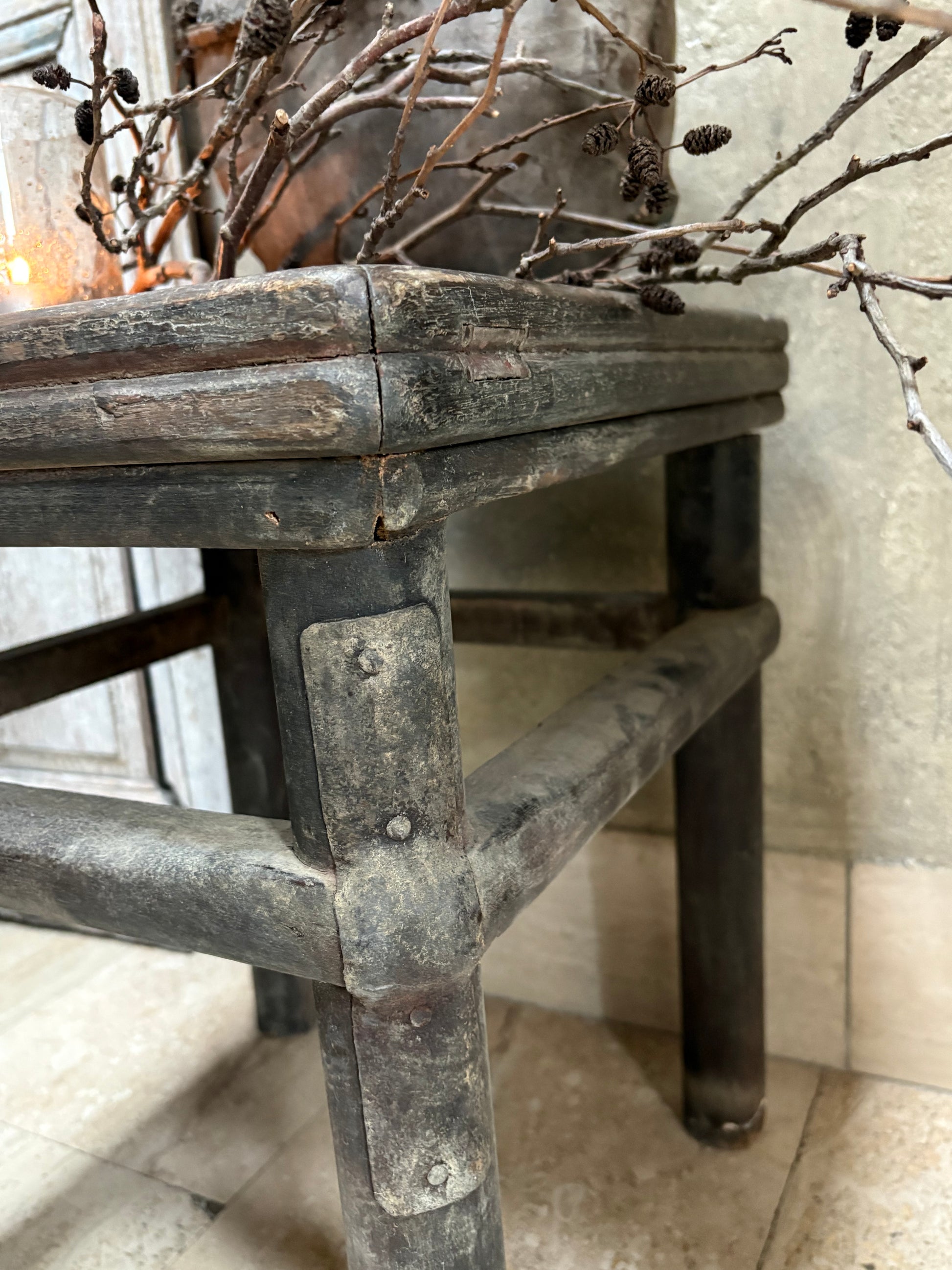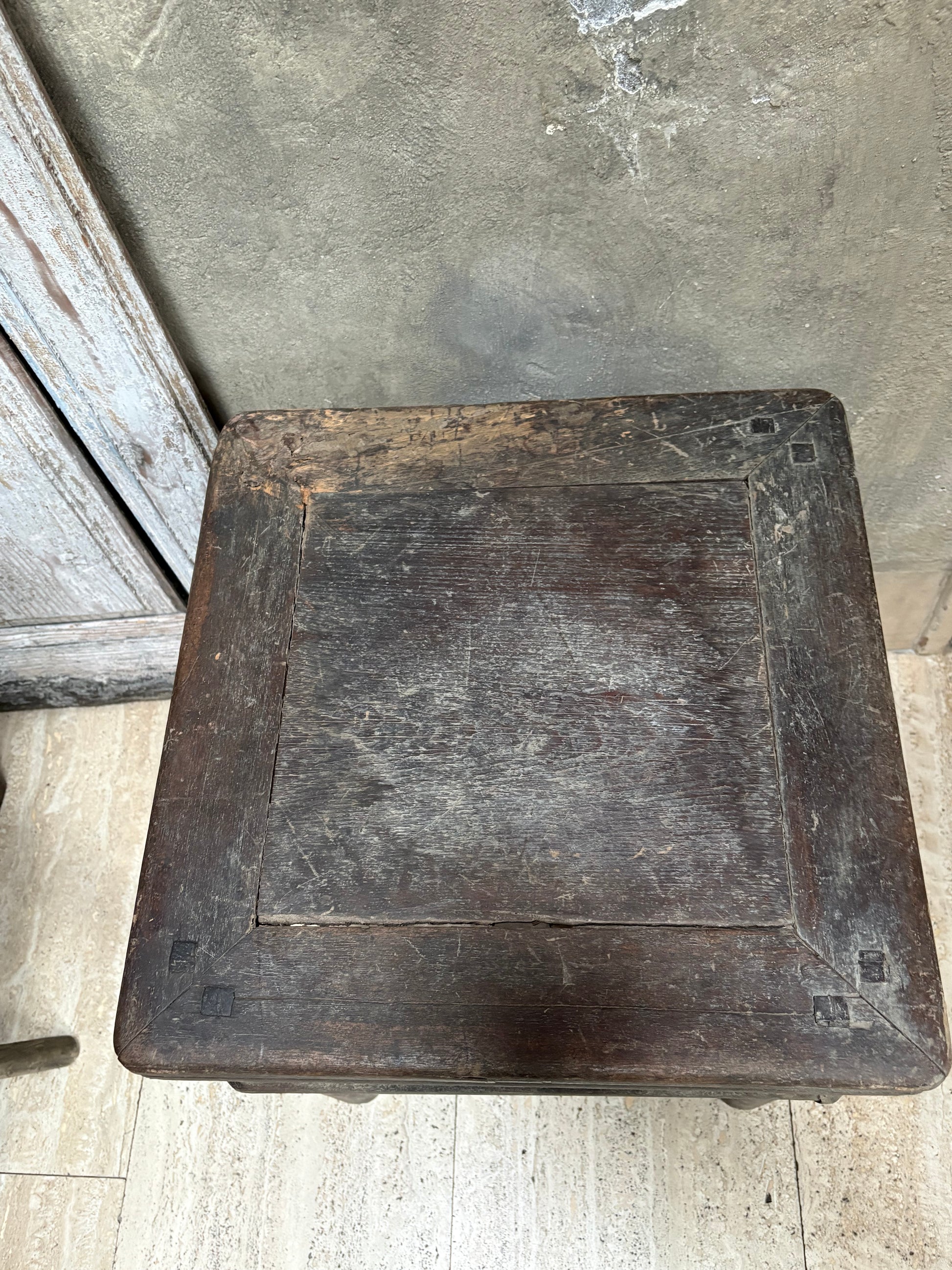 Oud houten tafeltje in een donkere kleur met stoere details