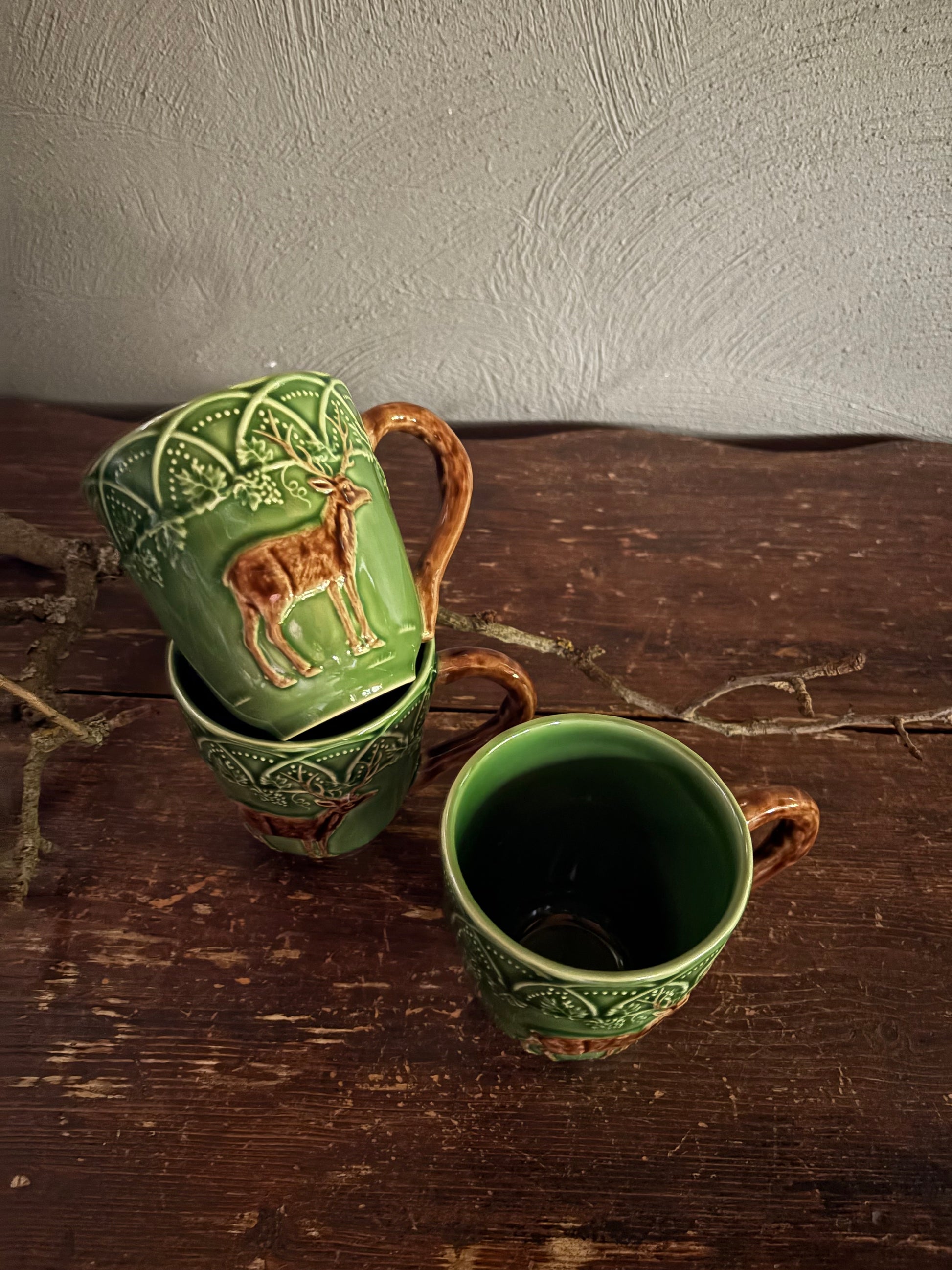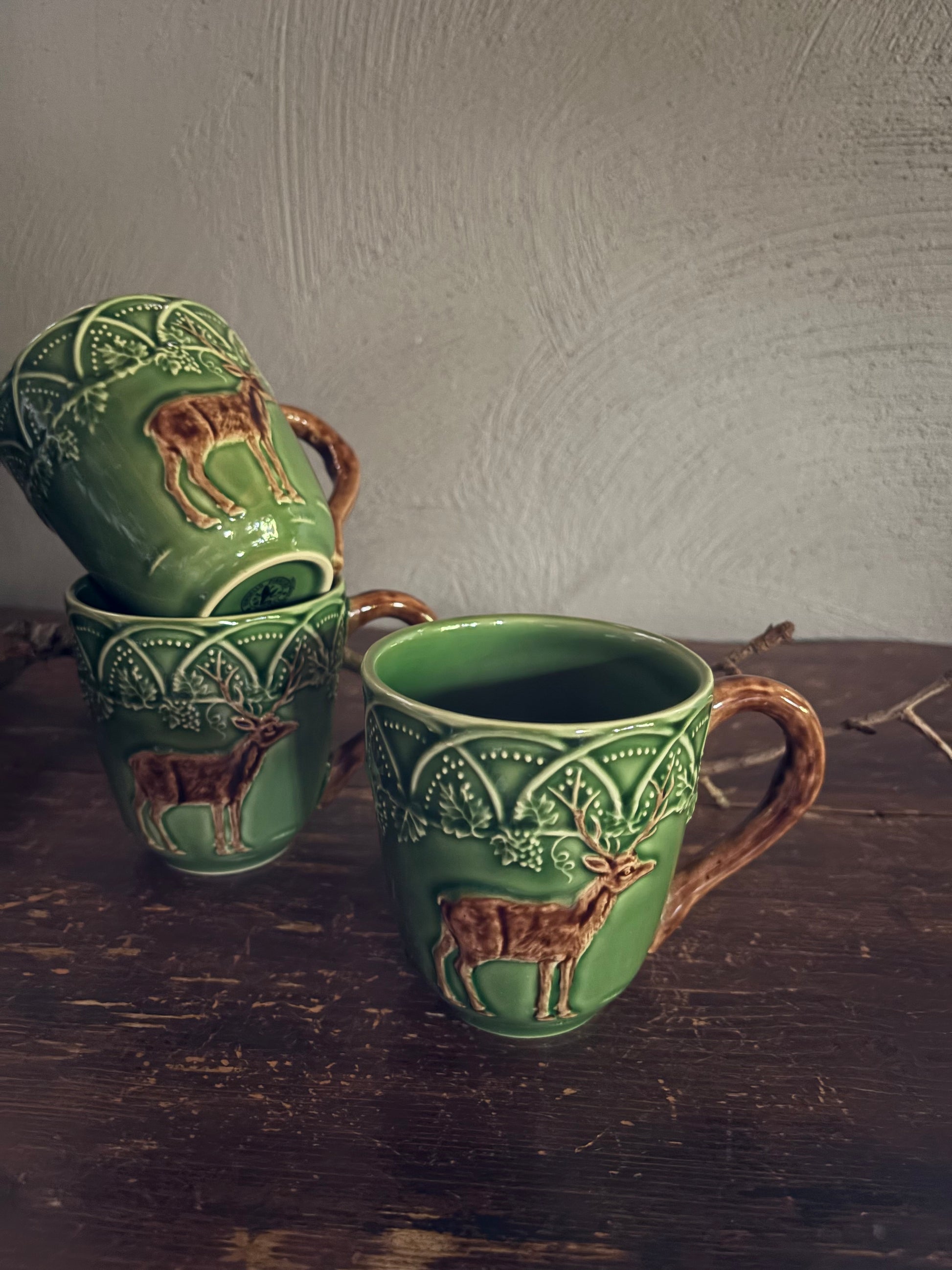 Deze groene mok met rendier schildering van het merk Bordallo Pinheiro heeft een inhoud van 400ml.
