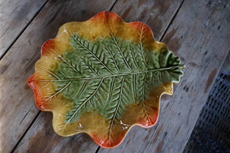 Dit grote serveerbord in de vorm van een herfstblad is handgemaakt van het merk Bordallo Pinheiro.