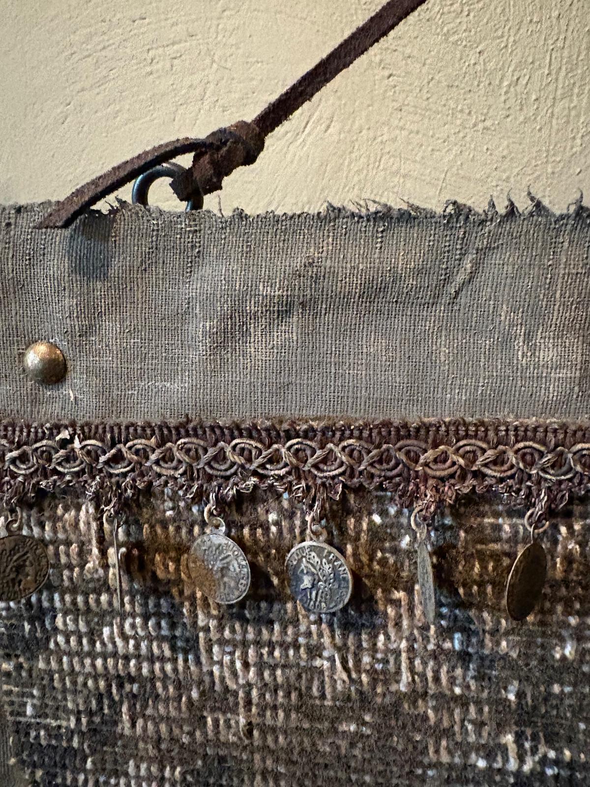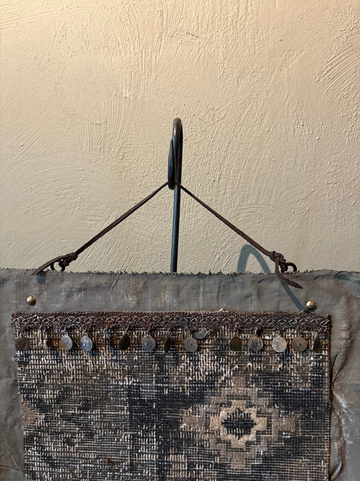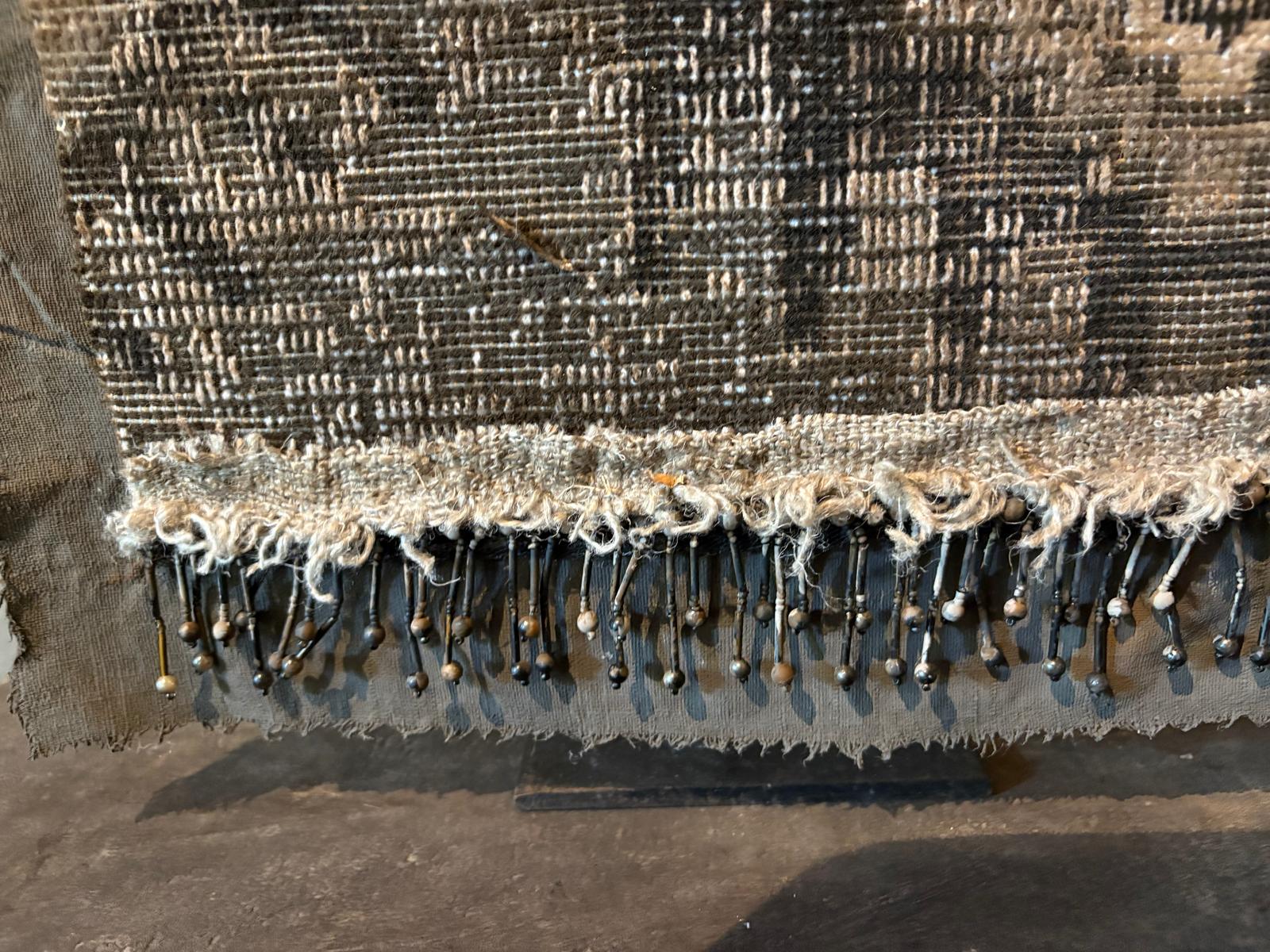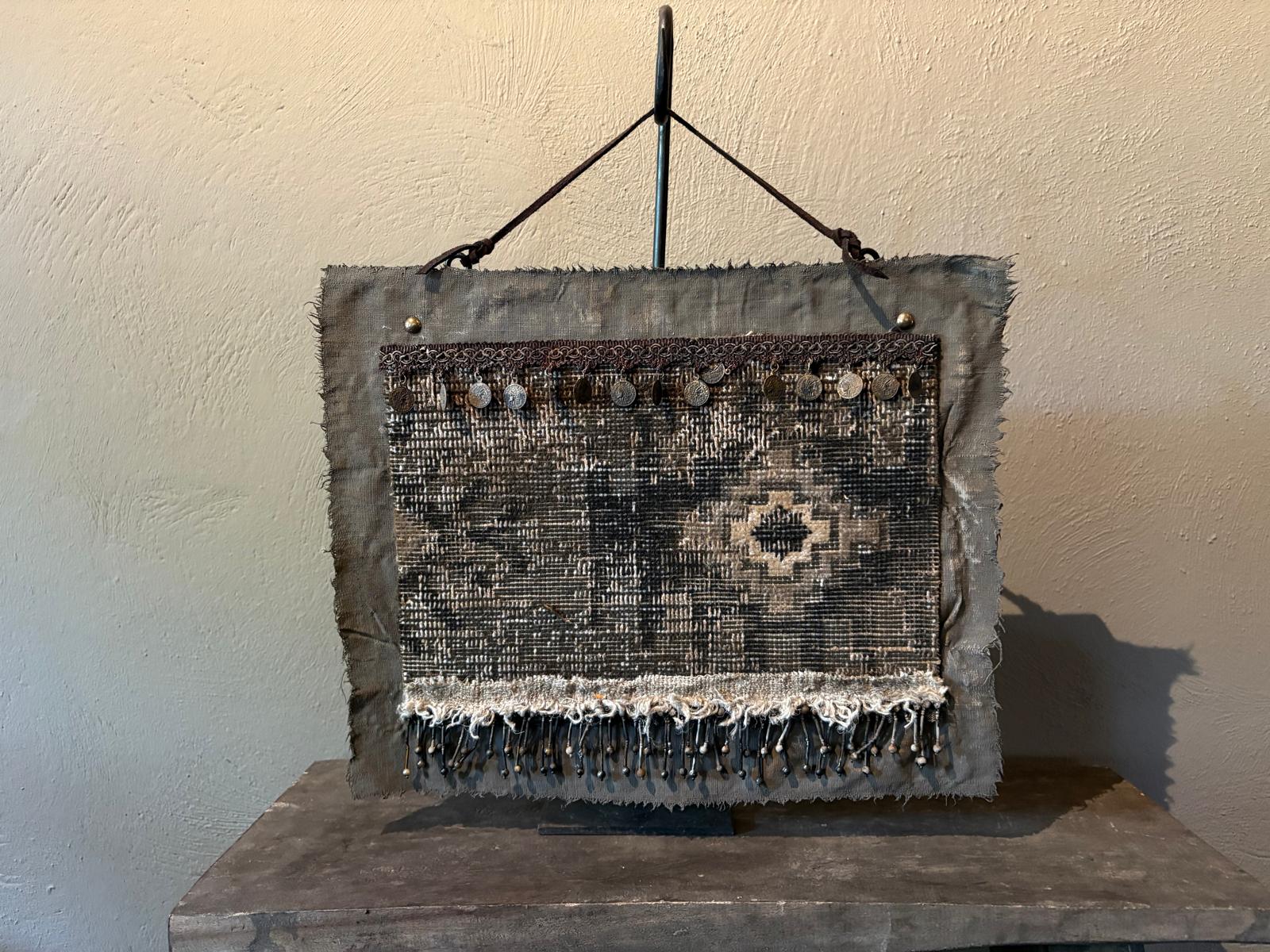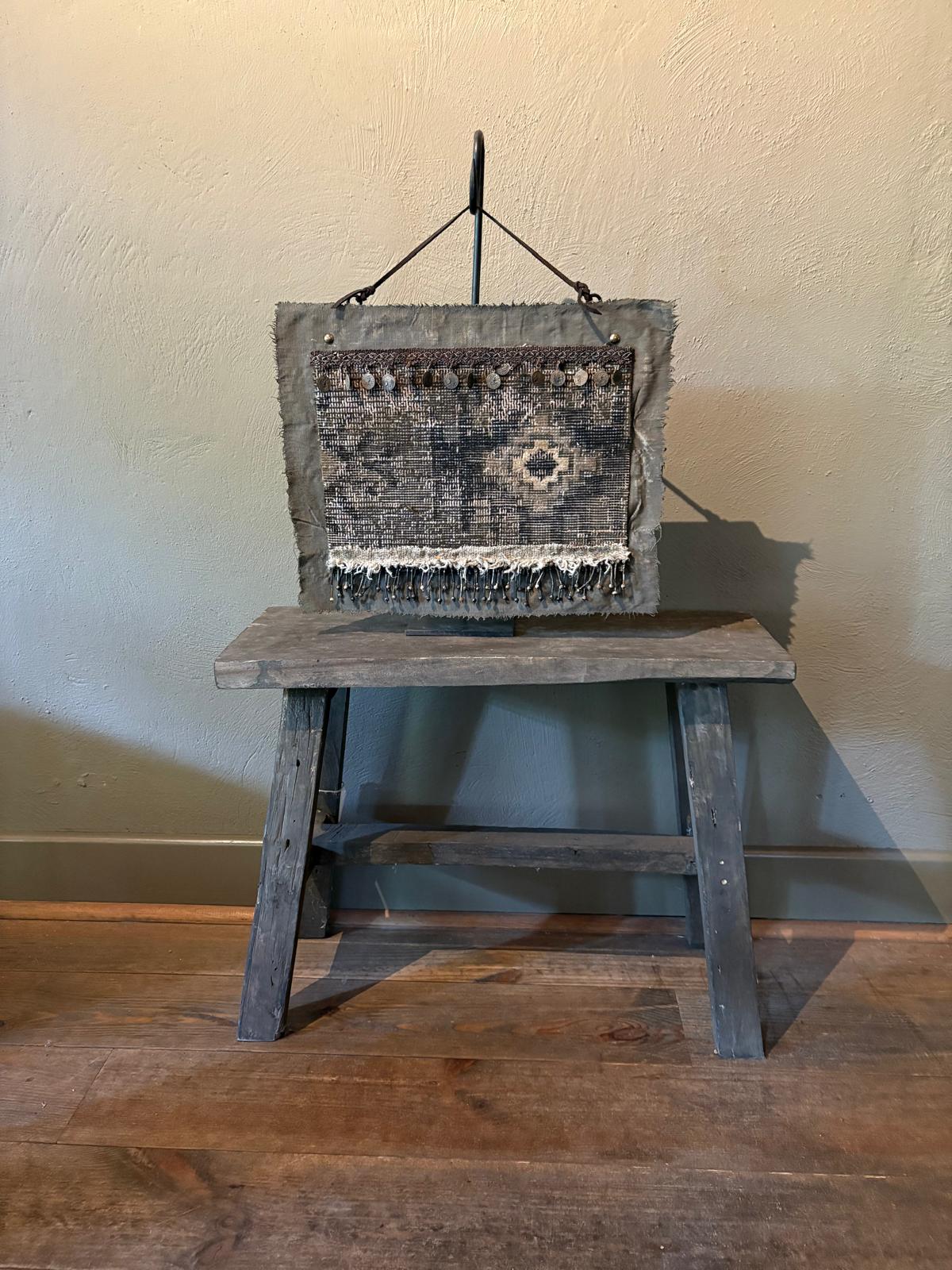 Dit handgemaakte, linnen wandkleed staat op een standaard. De afmeting hiervan zijn 41 x 32 x 52 cm inclusief de standaard.