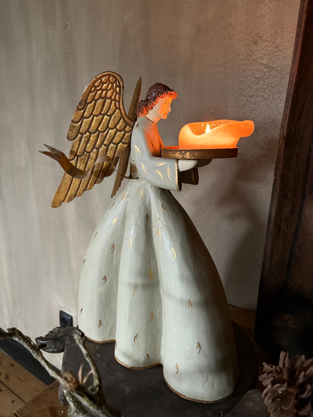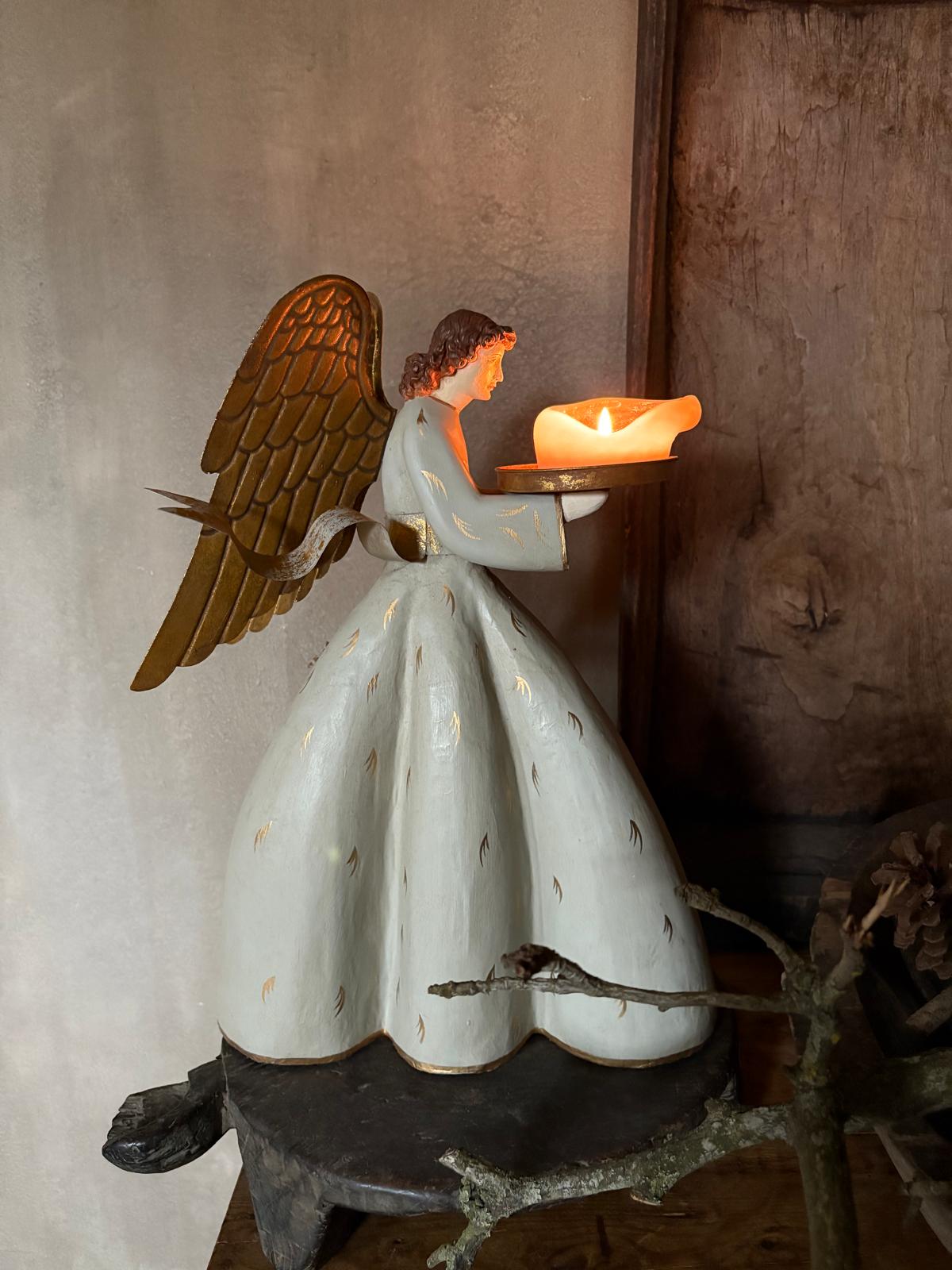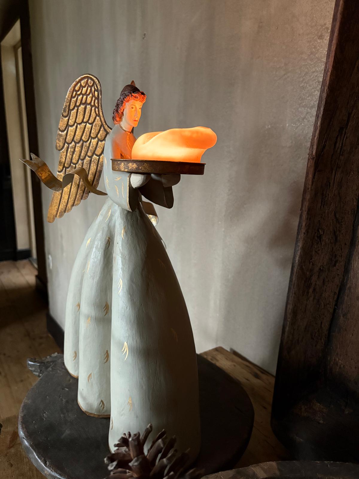 Deze handgemaakte engel heet een porseleinen gezichtje en een jurk gemaakt van papier-maché in een groengrijze kleur met gouden accenten. De afmetingen van de engel zijn 45 x 32 cm. Het plateau kan worden gebruikt om kaarsen op te zetten.