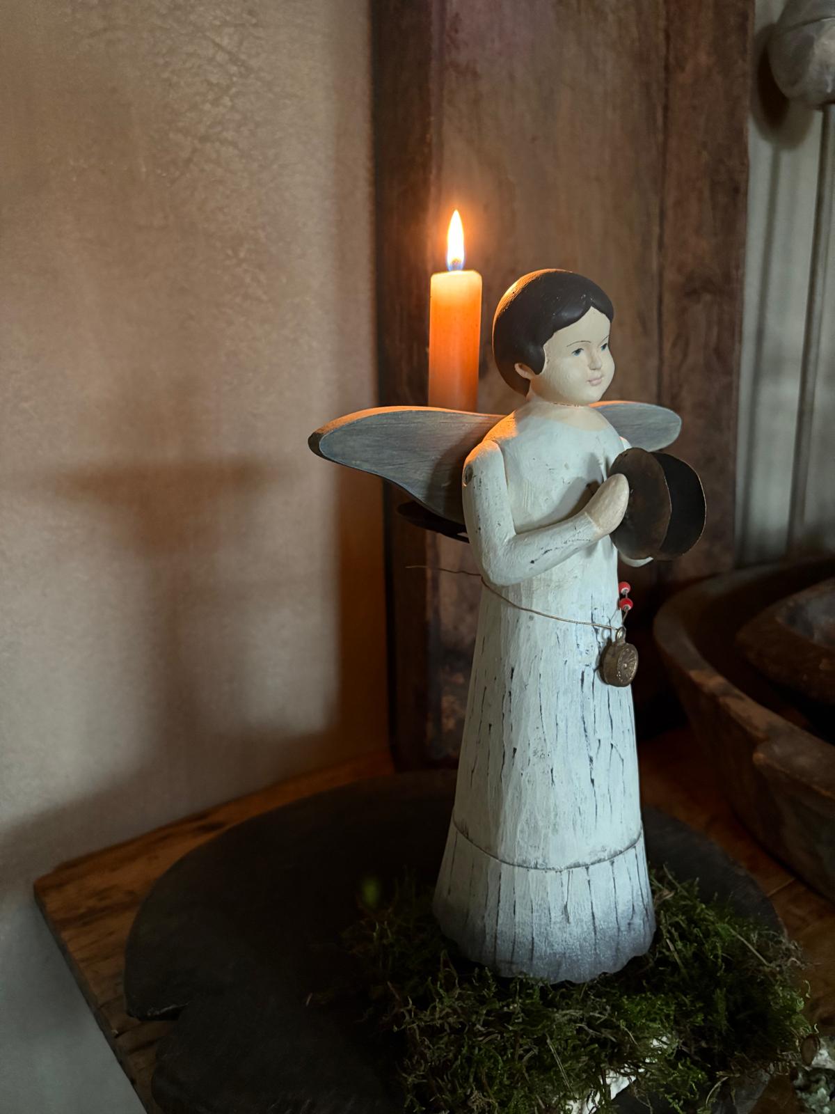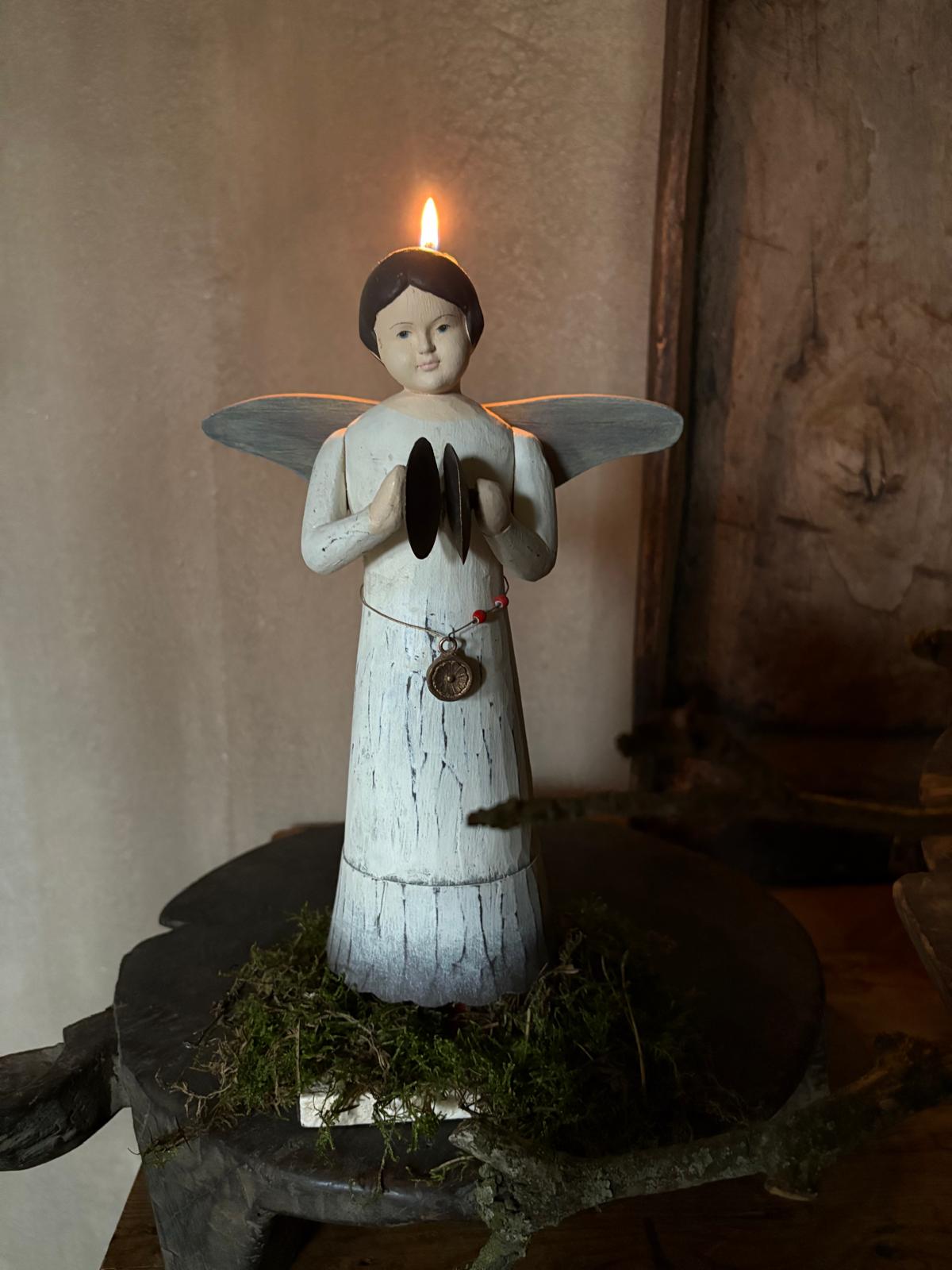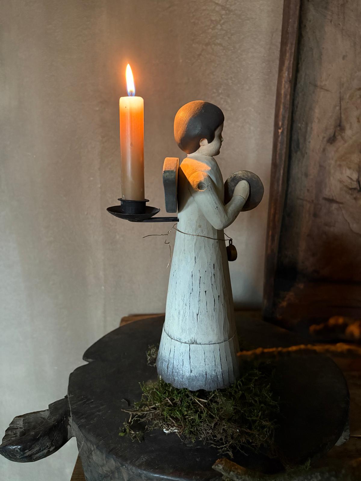 Deze handgemaakte engel heeft een porseleinen gezichtje en een jurk gemaakt van hout. Het beeld heeft een kandelaar op de rug met bekkens. In totaal is de engel 32 cm hoog.