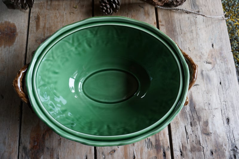 Deze soepkom met hertenopdruk van het merk Bordallo Pinheiro heeft een afmeting van 17 x 32 x 23 cm. Hier past 3 liter in.