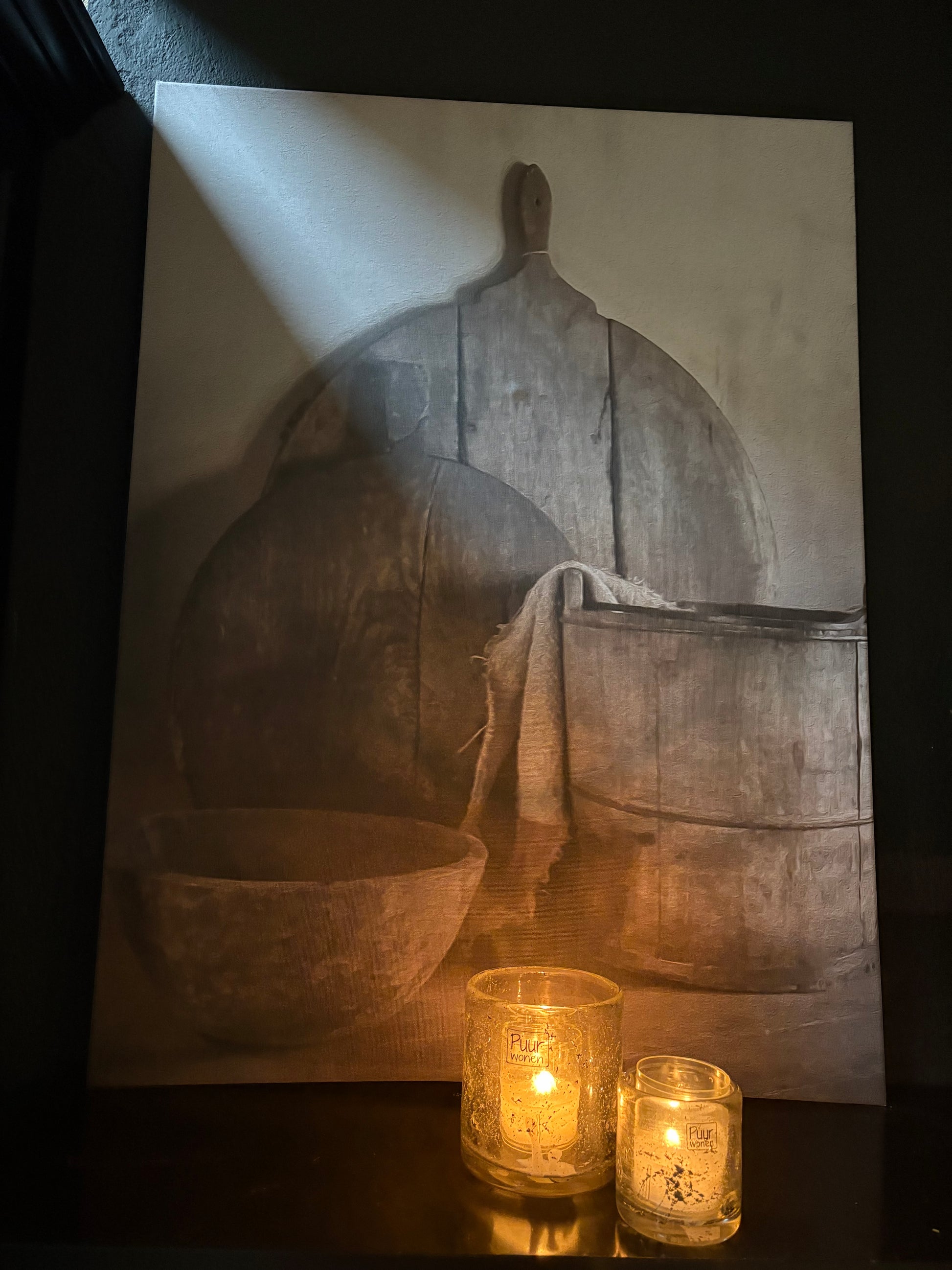Wanddoek, op linnen geverfd, prachtig in een sobere landelijke stijl.