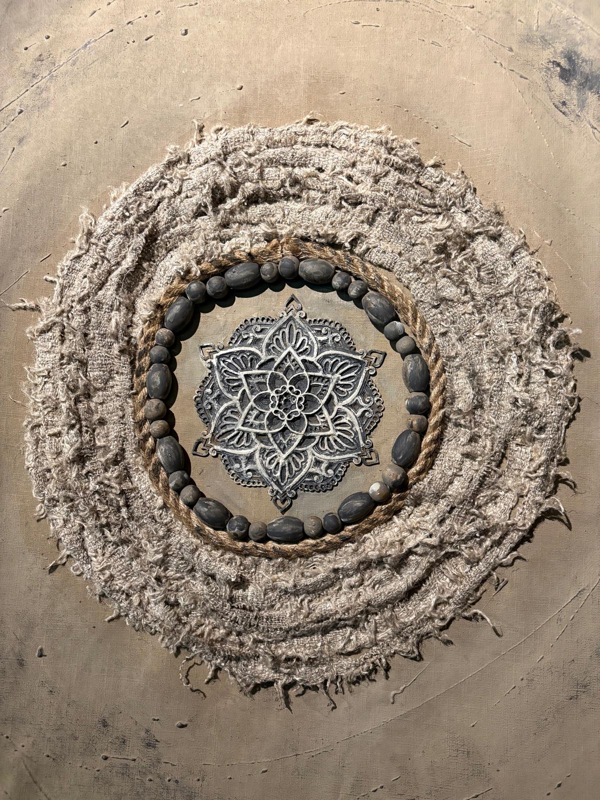 Dit unieke wandkleed is gemaakt op een linnen doek met handgemaakte decoratie. De afmetingen van het doek zijn 66 x 101 cm.