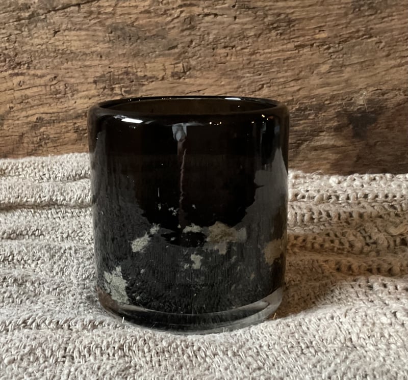 Dik mondgeblazen glas. Donker pigment verwerkt in het glas. De metal chips dwarrelen rond. Elk stuk is uniek.