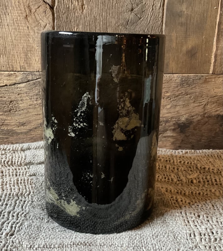 Dik mondgeblazen glas. Donker pigment verwerkt in het glas. De metal chips dwarrelen rond. Elk stuk is uniek.