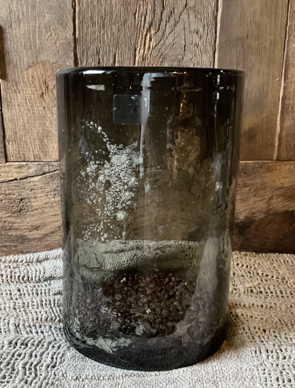 Dik mondgeblazen glas. Donker pigment verwerkt in het glas. De metal chips dwarrelen rond. Elk stuk is uniek.